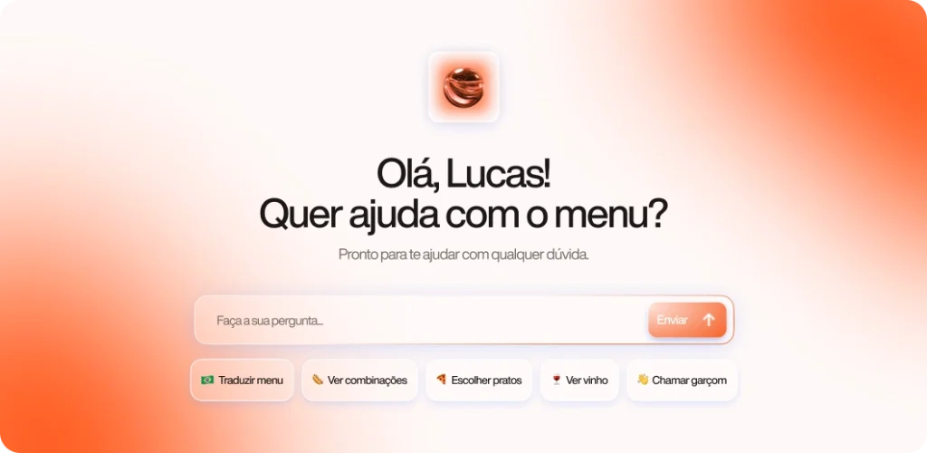 O cliente conversa diretamente com o menu: faz perguntas, pede sugestões e recebe recomendações automáticas de pratos, vinhos e sobremesas. A IA compreende o cardápio completo e responde de forma natural, criando uma experiência interativa e envolvente.