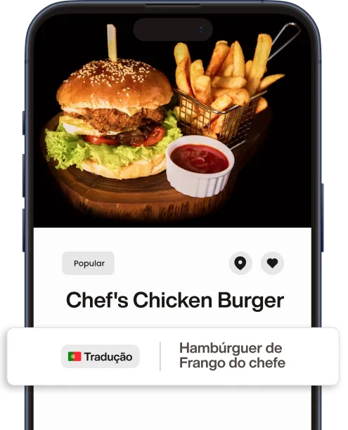 O iaMenu traduz automaticamente o seu menu para português, inglês, espanhol, francês, italiano e alemão. O cliente vê o cardápio no idioma dele, escolhe os pratos diretamente no telemóvel e o empregado de mesa apenas confirma o pedido.